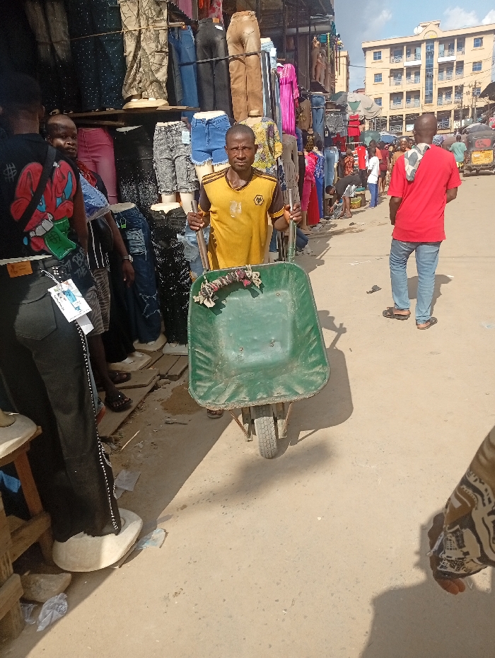 The image depicts an outdoor market scene in Nkwelle, Nigeria, under bright daylight conditions. In the foreground and center, a male individual of dark complexion, wearing a yellow short-sleeved t-shirt with a dark emblem on the chest, stands holding the handles of a green, well-used, single-wheeled wheelbarrow. He is looking directly towards the camera. The wheelbarrow's basin contains some dark, indeterminate material. To the immediate left, a person is visible from the lower torso down, wearing black trousers with white vertical stripes along the outer seams and distinctive large white platform shoes. Behind this individual, the back of another person wearing a black t-shirt with a multi-colored graphic design (featuring red, blue, green, and white elements) is present. Along the left side of the frame, an open-air market stall displays numerous items of clothing, primarily pants and shorts, on mannequins and hangers under a metal-framed structure. To the right of the central figure, an adult male in a red t-shirt, blue jeans, and sandals is walking away from the camera, with a patterned cloth draped over his right shoulder. In the background, a multi-story beige building with numerous windows stands against a clear sky. Further down the street, additional people are visible, and a yellow motorized tricycle is partially discernible. The ground surface is a light-colored, unpaved or gritty concrete, with some scattered litter. Sunlight creates distinct shadows throughout the scene.