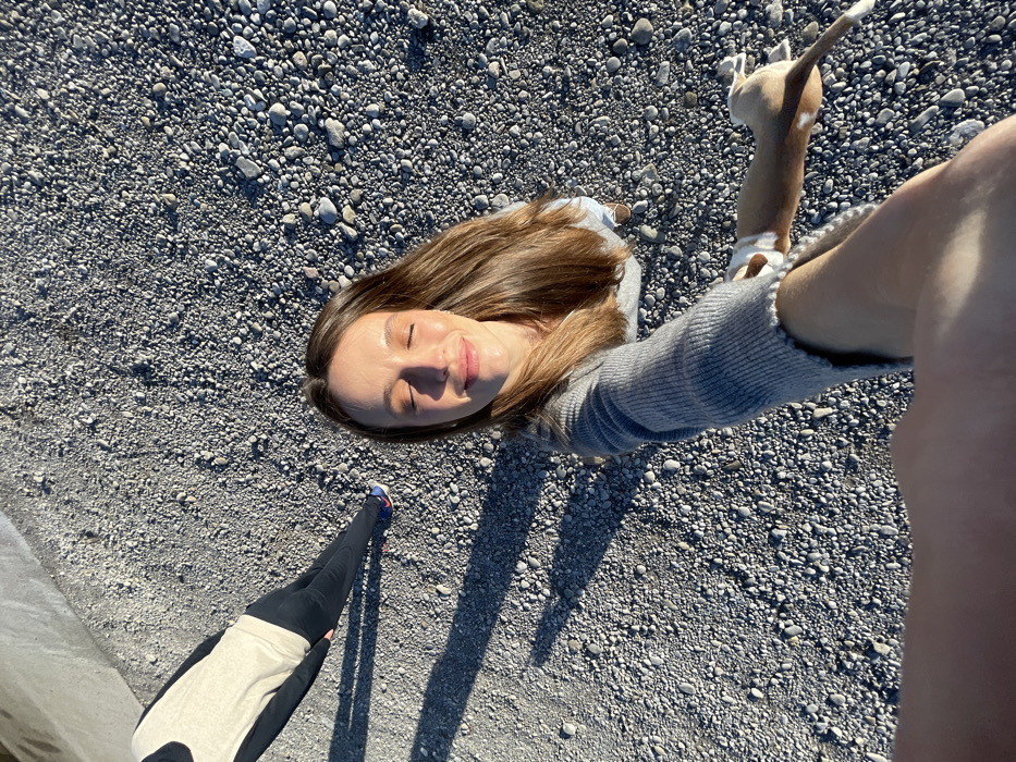 The scene depicts an outdoor setting in Mojanovići, Montenegro, on a surface composed of numerous grey and white pebbles. A female individual, with long brown hair, is captured from a high-angle perspective, extending her right arm into the frame, suggesting she is taking a photograph. She is wearing a grey ribbed long-sleeve top. Her eyes are closed, and she displays a slight smile, with her face illuminated by direct sunlight, casting an orange hue. To her right, a small, light brown and white dog is visible, appearing to be in mid-leap or stretching, positioned near her extended arm. In the upper left background, the lower torso and legs of a second individual are partially visible, clad in a light-colored top, dark leggings, and blue and red athletic shoes on their left foot. Distinct, elongated shadows are cast across the pebbled ground, indicating strong, low-angle sunlight.