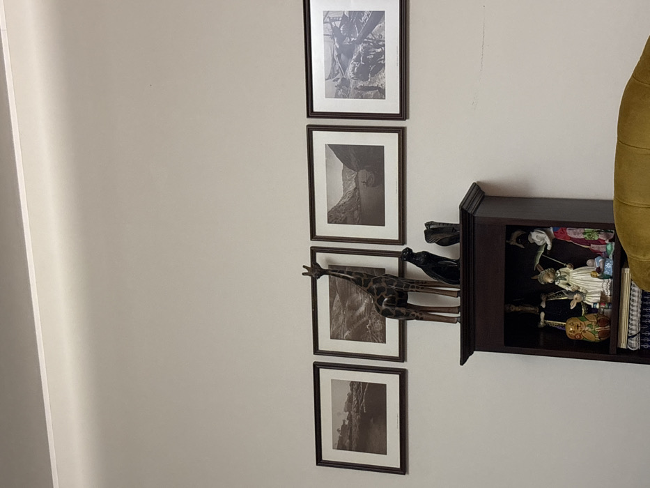 Four framed black and white photographs hang vertically on a light-colored wall, adjacent to a dark wooden shelf. The shelf is partially filled with decorative items, including figurines and what appears to be fabric. A giraffe figurine extends from behind the shelf, obscuring the photographs. A yellow-gold cushion is partially visible to the right of the shelf.