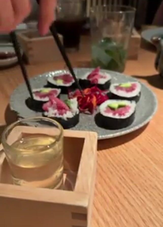 The camera focuses on a round, gray plate with six pieces of sushi on a wooden table. A pair of black chopsticks is used to rearrange a piece of the sushi and move the decorative red garnish. There is a wooden sake cup with sake in it beside the plate. In the background, there are other tables and people, and glasses with drinks.