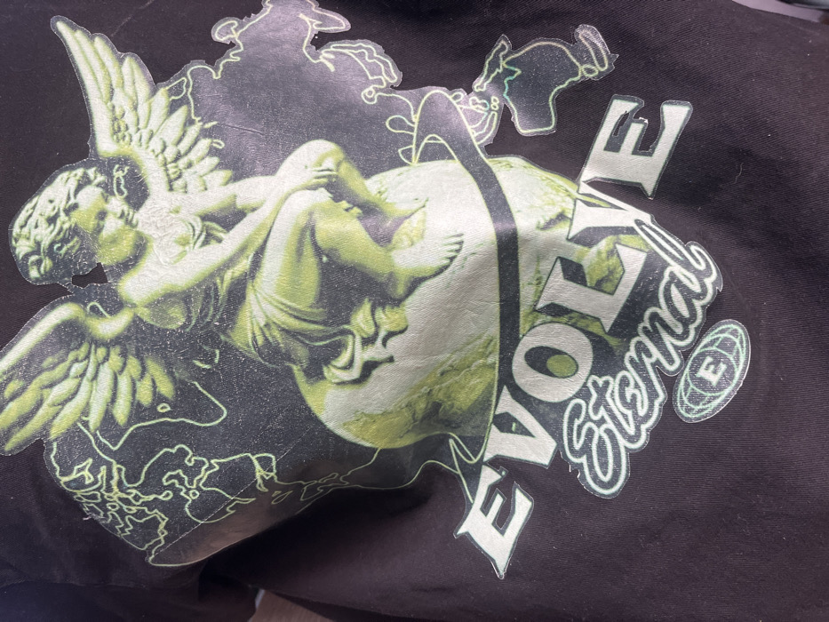 The image displays a close-up, oblique view of a black fabric garment, likely a t-shirt, featuring a prominent graphic design. The central element of the design is a winged, classical-style figure, resembling a cherub or angel, rendered in a light greenish-yellow hue. This figure is depicted seated on a spherical object, stylized as a globe or planet, also in similar greenish-yellow tones. Behind this central motif, faint outlines of continents from a world map are visible in the same greenish-yellow color, showing parts of Europe, Africa, and Australia. Below the globe, the word "EVOLVE" is prominently displayed in large, bold, outlined letters. Below "EVOLVE," the word "Eternal" is written in a script font, underneath which is a small oval emblem containing the letter "E". The graphic print shows signs of wear, including minor cracking and slight lifting of the transfer material, particularly noticeable on the edges of the figures and text. The background is the plain black fabric of the garment. There are no discernible environmental cues or subjects in the image to indicate a specific geographic location within the city of Jos, Nigeria, or any other area.
