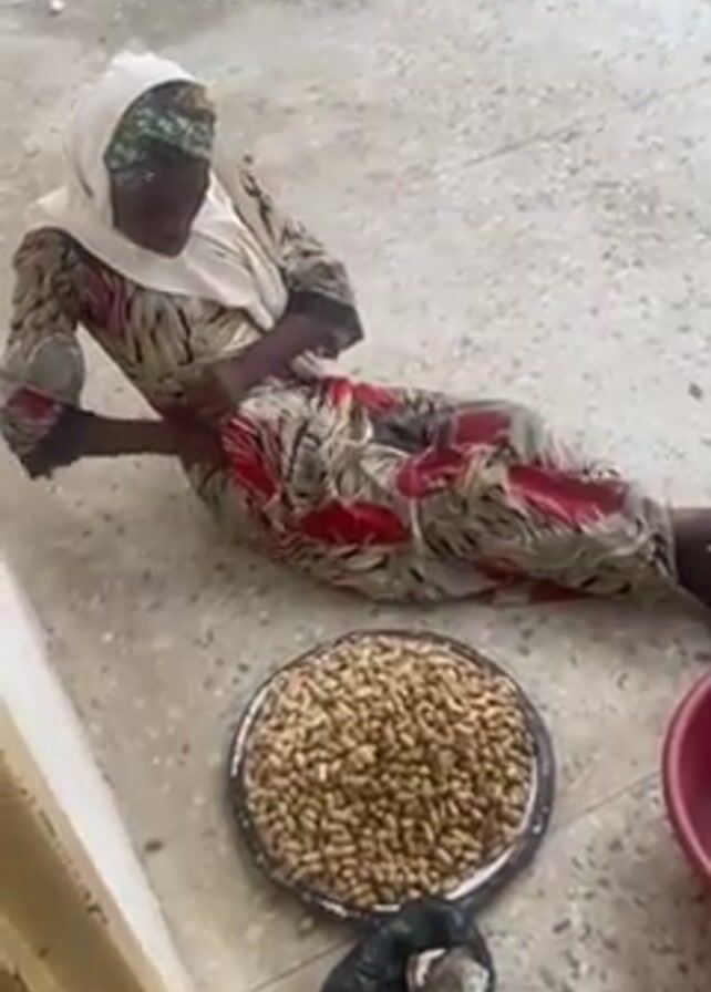 A woman wearing a long, patterned dress and a white head covering is sitting on the ground. She is peeling peanuts from a large tray in front of her. She is using both hands to peel the peanuts. Next to the tray of peanuts is a red bowl and a black plastic bag. The floor is a light color.