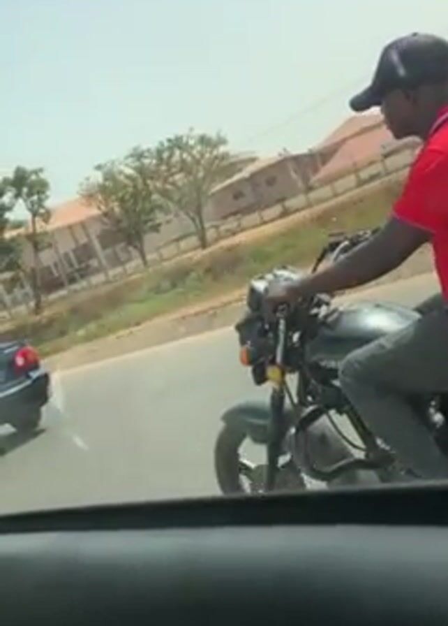 A person is filming from inside a car, driving on a road with other vehicles and pedestrians. In the first shot, a man on a black motorcycle wearing a red shirt and black hat pauses at the side of the road as two people walk across the street. The camera then follows a dark blue sedan as it proceeds down the road past a large building. The sedan pulls to the side of the road. The video continues as the cameraman’s car continues driving down the road. The sky is bright and clear.