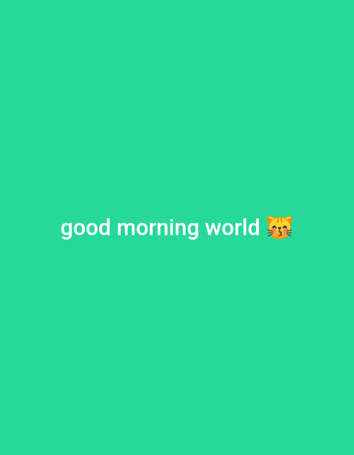 The image displays a solid, uniform background of a teal or aqua green color. Centered horizontally on this background, slightly above the vertical midpoint, is white text that reads "good morning world". Immediately to the right of the word "world", a yellow-orange cat face emoji is present, depicted with closed eyes, whiskered cheeks, and puckered lips, indicating a kissing expression. There are no other discernible subjects, objects, people, actions, or interactions within the frame. The image does not contain any visual information or contextual clues that would allow for the identification of a specific geographic location, including the city of Dortmund, Germany. The scene is purely digital text and emoji on a colored background.