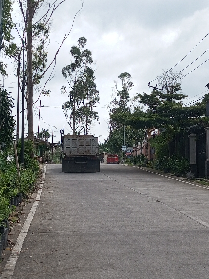 A long, gray road stretches into the distance under an overcast sky. A large, gray dump truck occupies the road's center. Lush greenery and small potted plants line the left side of the road, contrasting with the stone and wrought iron fences on the right. Tall, slender trees with sparse foliage are interspersed throughout the scene. Further down the road, a red vehicle is partially visible. Utility poles and wires run overhead.