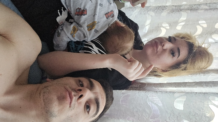 The image captures an indoor scene in the city of Burgas, Bulgaria, featuring three individuals. A woman with blond hair styled in an updo is positioned in the upper left, wearing a dark top. She has visible makeup, a slight pout, and her left index finger is extended forward. A light-colored object, possibly a smartphone, is held in her right hand, partially visible. Resting against her is a baby or young child with light brown hair, wearing a light grey long-sleeved top patterned with red and yellow vehicles. In the lower right, a man with dark hair and light facial stubble is reclined, shirtless, and looking directly at the camera with a slight pout. The background consists of a translucent white curtain with a repeating wavy or floral pattern. The individuals appear to be situated on a surface covered by blue fabric.