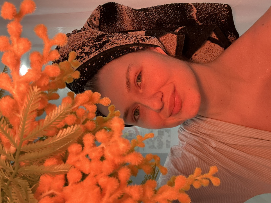 A woman with a towel on her head smiles. Her skin is flushed with a warm orange hue, and she wears a striped shirt. In the foreground, vibrant orange faux coral obscures part of the view. The background reveals a glimpse of a room with patterned wallpaper. The overall impression is intimate and candid.