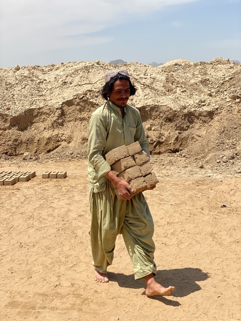 - "A man stands barefoot in a dusty, arid landscape in Deh-E Bagh, Afghanistan, carrying a stack of mud bricks" by FM-B5wmg2, licensed under CC BY 4.0