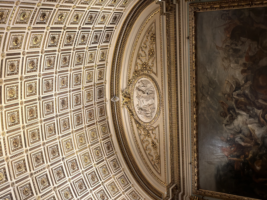 The image depicts a grand interior within the Palatine Gallery, Sala di Giovanni da San Giovanni, located in the Palazzo Pitti, Florence, Italy. The upper section reveals a segment of an arched, coffered ceiling, featuring a grid of square recesses. Each recess contains an octagonal or circular medallion with gilded decorative elements, likely shells or floral designs, set against a light-colored background. Beneath the coffered ceiling, a richly ornamented architectural arch spans horizontally across the frame. This arch is adorned with multiple layers of gilded molding, displaying intricate patterns. At its apex, a central gilded cartouche or decorative element is visible, flanked by scrolling ornamentation. Within the arch's spandrel, a large, oval bas-relief sculpture in a light material depicts three classical draped figures in a dynamic arrangement, with fabric flowing around them. Gilded floral and scroll motifs frame this medallion along the curve of the arch. Below this elaborate architectural frieze, a massive, rectangular oil painting is displayed, enclosed in a robust gilded frame. The painting portrays a tumultuous battle scene, dominated by numerous figures engaged in close combat. Soldiers on horseback and on foot, armed with spears and swords, are depicted in a chaotic melee. The palette is predominantly dark, with highlights on armor and horses, conveying a sense of intense action and drama. The background of the painting suggests a smoky or cloudy environment, with faint, possibly allegorical, figures discernible in the upper left quadrant. No living individuals are present as observers in the depicted scene.