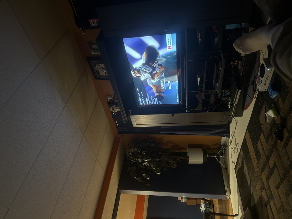 A television displays a hockey game. Below it is a cabinet with a dark curtain obscuring the bottom. To the right is a gaming console, controllers, and a white athletic sock. A faux plant stands in a white pot near a dark blue wall. A rug with a geometric pattern lies on the floor. The room appears cluttered with wires. The ceiling is textured and has a border along the wall.