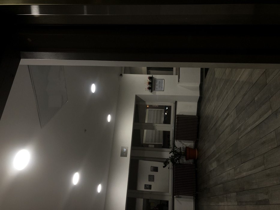 A dimly lit hallway features gray wood-look flooring and a white wall with evenly spaced, round recessed lights. A set of windows with blinds are visible, along with two dark-colored radiators and a potted plant. Wall art decorates the space below the windows. A small shelf with decorative items and a framed document is positioned above the windows. A security camera is mounted near the ceiling. The view is framed by a dark gray or black doorway, creating a sense of depth and perspective.