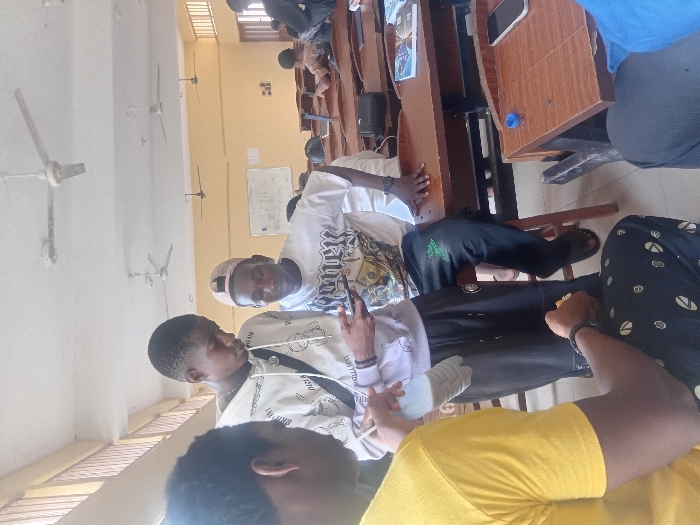 The image depicts a classroom in Ukukwa, Nigeria. Three males are in the foreground, engaged in an interaction. A male in a white hooded sweatshirt and dark pants holds a smartphone, focusing his gaze downward at its screen. Adjacent to him, a male wearing a white graphic t-shirt, dark jeans, and a backward baseball cap is seated on a wooden chair, leaning forward with his right arm on a desk, and observing the smartphone screen. To their left, a male with his back partially to the camera wears a yellow t-shirt and patterned pants, holding a light-colored plastic bottle in his left hand. The classroom environment features light yellow walls, a light-colored ceiling with multiple white ceiling fans, and rows of wooden desks and chairs. A whiteboard is visible on the rear wall. Several other individuals are seated at desks further back in the room. A second smartphone and a blue bottle cap are present on a desk in the foreground right.