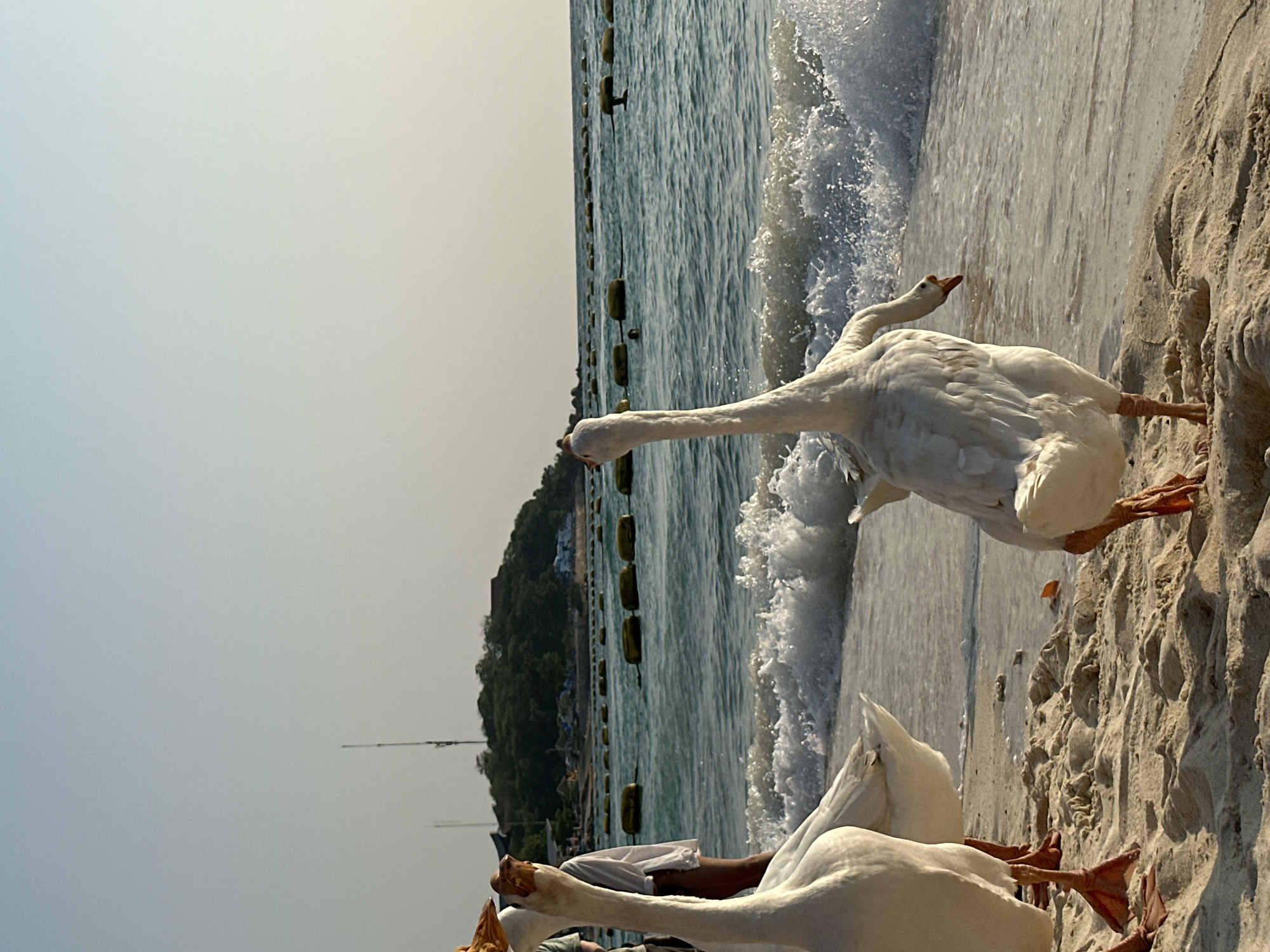 The image captures a scene at a beach in Pattaya City, Thailand. In the foreground, several white geese are positioned on the sandy shore near the waterline. One goose has its neck extended, reaching towards the sea. The waves are visibly crashing against the shore. In the midground, a coastline with vegetation and buildings can be seen. A line of buoys is visible in the water, running parallel to the shore. The sky is clear and bright, indicating a sunny day.