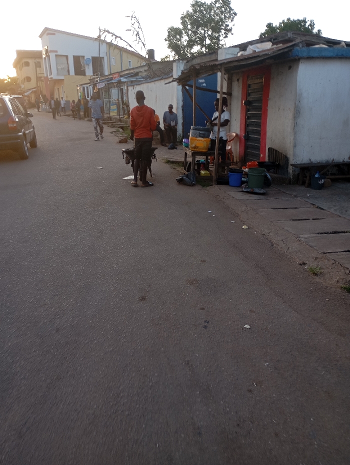 The image depicts a street scene in Jos, Nigeria, during daylight hours, likely late afternoon, with soft, golden light. The foreground features a paved asphalt road, dark in tone with some lighter scuff marks and debris. To the right, a raised concrete curb separates the road from a dirt and gravel verge, where a drainage channel is partially visible. In the mid-ground, a male individual, observed from behind, stands facing slightly right, wearing an orange long-sleeved shirt and dark trousers. He is positioned near a dark-colored bicycle or motorcycle, possibly with a luggage rack. Adjacent to him, on the right side of the road, is a cluster of rudimentary commercial structures. The closest one is a single-story, whitewashed building with a red-painted door or shutter and a blue-painted top edge. A corrugated metal awning extends from its front. In front of this structure, a makeshift vendor stand is set up, featuring a yellow cooler, several plastic buckets (blue and green), and various containers. Two male individuals in white t-shirts are standing near this stand, one facing the camera's general direction, the other looking down. A third male in a darker shirt is partially visible behind them, near the entrance of the stall. Further down the street on the left, a dark-colored sedan, possibly a Toyota, is parked or moving slowly away from the camera. Multiple pedestrians are visible in the distance on the left side of the street; one male in a light-colored top and patterned trousers walks towards the foreground. Buildings line both sides of the street, including a prominent two-story structure on the left with a white and yellow facade, featuring multiple windows and a balcony-like element. Overhead, sparse tree branches are visible against a bright, hazy sky. The overall environment suggests a busy commercial or mixed-use area.
