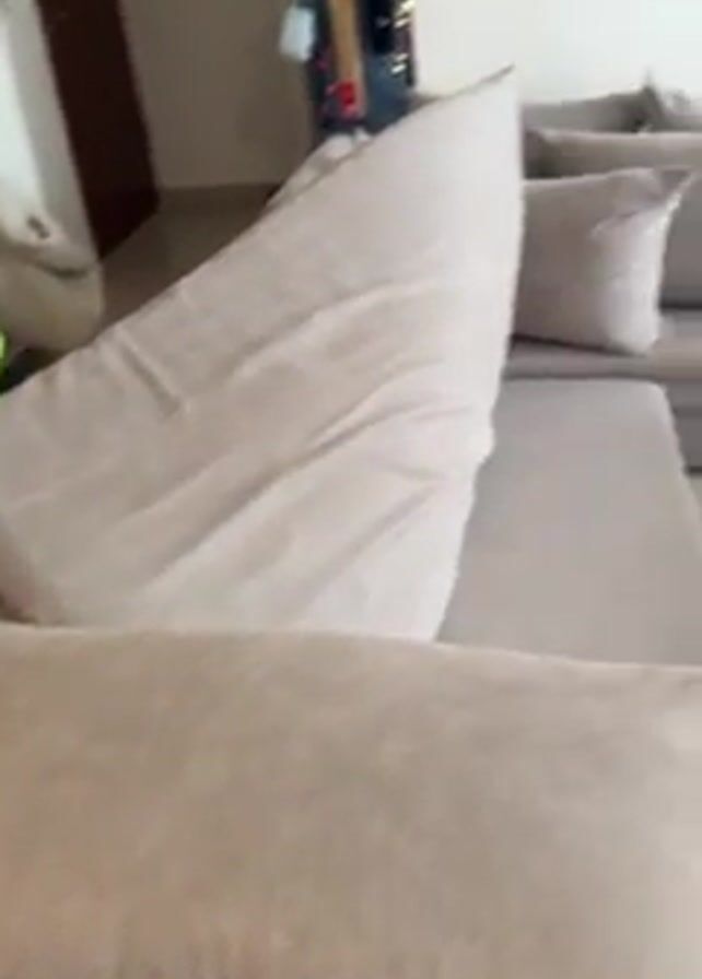 The video pans through an apartment showing a sofa, pillows, a table, a manicure station set up with lamps, a nail drill, and bottles, and a person holding up two fingers in a peace sign