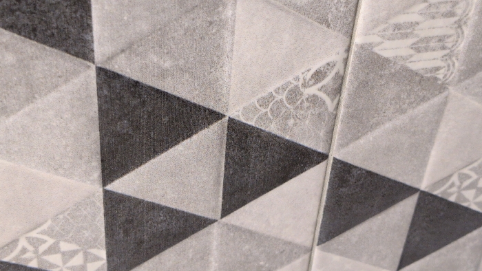 This image presents a close-up, angled view of a textured tiled wall located in Oreshak, Bulgaria. The wall is composed of rectangular ceramic tiles forming a geometric pattern of tessellating triangles. These triangles alternate in color between dark grey and light grey. Specific light grey triangles are adorned with subtle decorative elements: one features a repeating pattern of overlapping scales, another displays a stylized architectural motif resembling spires or tall windows, and a third exhibits a smaller triangular geometric design. Horizontal grout lines delineate the individual tile rows. No people or active events are present within the frame.