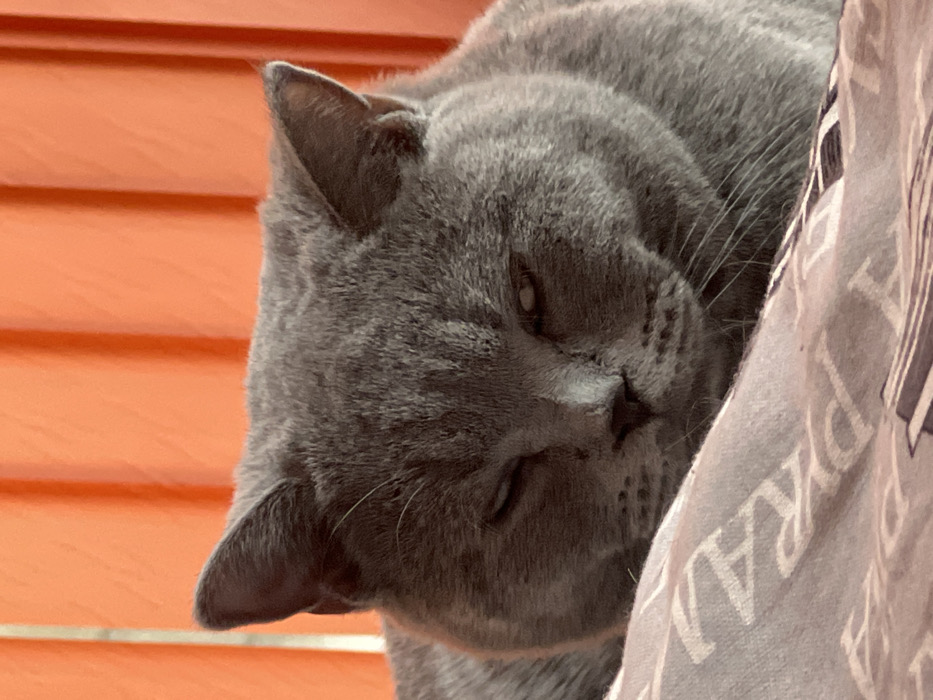 A close-up image depicts a solid grey-furred cat, consistent with a British Shorthair breed, lying in an indoor setting. The cat's face is prominent, with both eyes partially closed; the right eye (viewer's left) shows a visible nictitating membrane. The cat's head rests on a light grey patterned textile, which clearly displays repeating white or light-colored letters, with "PRAD" forming part of a brand name, likely "PRADA." The background consists of a bright, uniform orange surface, exhibiting vertical lines consistent with window blinds or pleated curtains. The lighting is diffused, illuminating the cat and the background. The specific location within the city of Sofia, Bulgaria, cannot be determined from the visual information provided in the image.