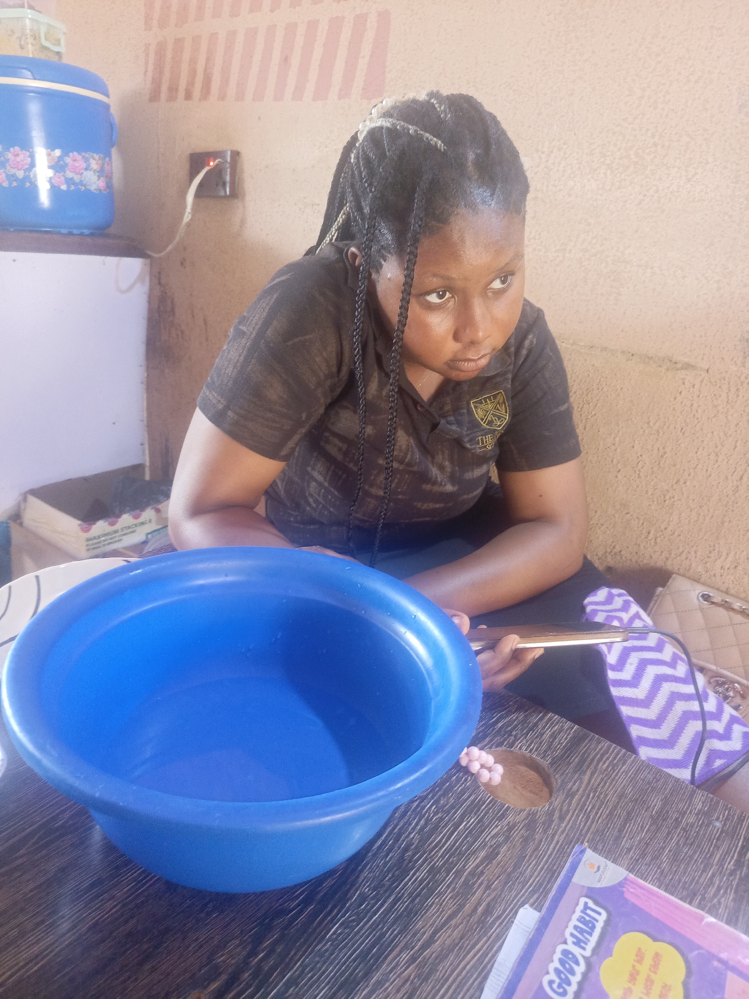 The image captures an indoor scene in the city of Unknown, Unknown. An adult female with dark skin and dark braided hair is seated at a dark wooden table with a visible grain. She is wearing a dark, short-sleeved collared shirt featuring a gold emblem on the left chest and is holding a gold-colored smartphone horizontally. Her gaze is directed to her left (viewer's left). On the table in front of her, a large, empty blue plastic basin is prominent. To the right of the basin, a small cluster of approximately eight light pink beads rests within a circular indentation on the table surface. A partial view of a book or magazine cover titled "GOOD HABIT" is visible in the bottom right corner. In the background, a light-colored wall with faint vertical striped patterns is visible on the left, transitioning to a textured, light-colored wall on the right. A blue plastic container with floral patterns and a light-colored lid is positioned on a white surface in the upper left. A dark electrical outlet with an illuminated red indicator light and an attached cable is mounted on the wall in the upper center. A light-colored quilted purse rests on a purple and white chevron-patterned fabric behind the seated individual.