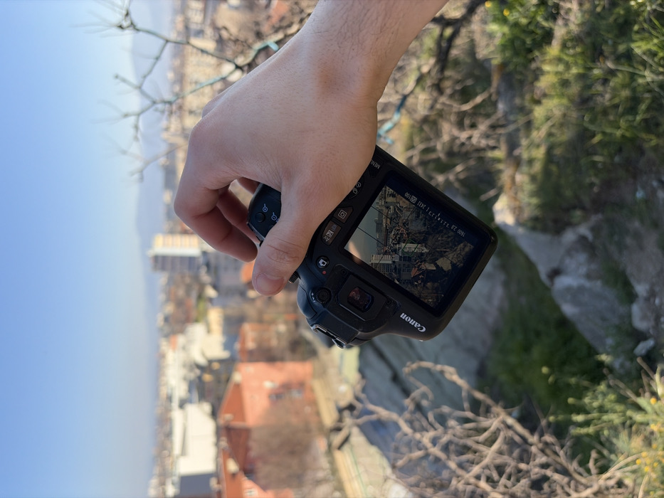 - "An overhead photograph captures a fair-skinned hand holding a black Canon DSLR camera against the backdrop of Plovdiv, Bulgaria, from an elevated natural vantage point" by FM-vetpu1, licensed under CC BY 4.0