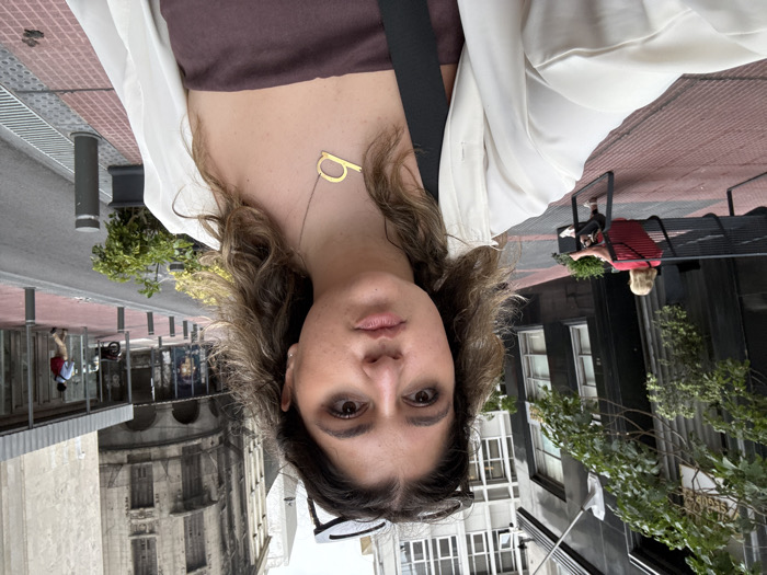 A woman poses for a selfie. She wears a brown top and a light jacket, a necklace with a "b" pendant, and eyeglasses on her head. The background features an urban street scene with a bricked sidewalk, buildings with windows, greenery, and people sitting on benches. A flag is partially visible. The image is somewhat blurry and rotated.