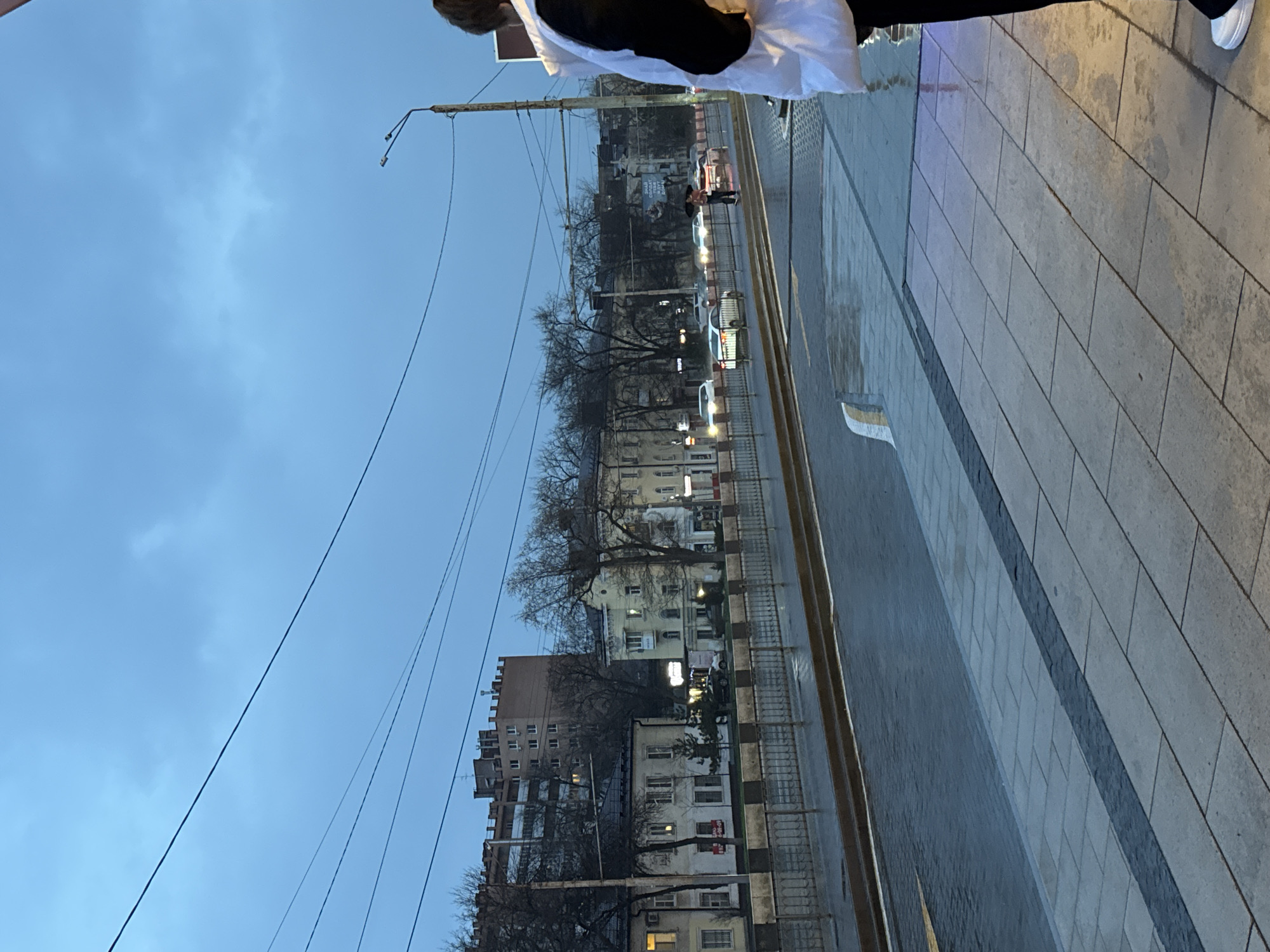 The image depicts an urban street scene in Aksay, Russia. A sidewalk composed of gray paving stones with a darker gray decorative strip runs along the right side of the frame. A wet road with tram tracks is visible adjacent to the sidewalk. On the opposite side of the road, there are several buildings of varying heights and architectural styles, interspersed with bare trees. Utility poles and overhead power lines are visible against a blue sky. There are cars parked along the street. A person wearing a black and white outfit is partially visible at the top of the frame.