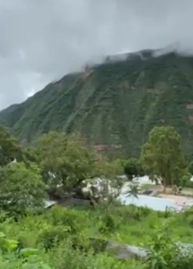 view of a lush green mountain under a cloudy sky. The mountain is covered with vegetation and has some visible layers of red soil. The top of the mountain is partially obscured by clouds. In the foreground, there are trees and bushes. There are also some buildings visible in the distance. The overall impression is of a natural landscape with a somewhat overcast atmosphere.