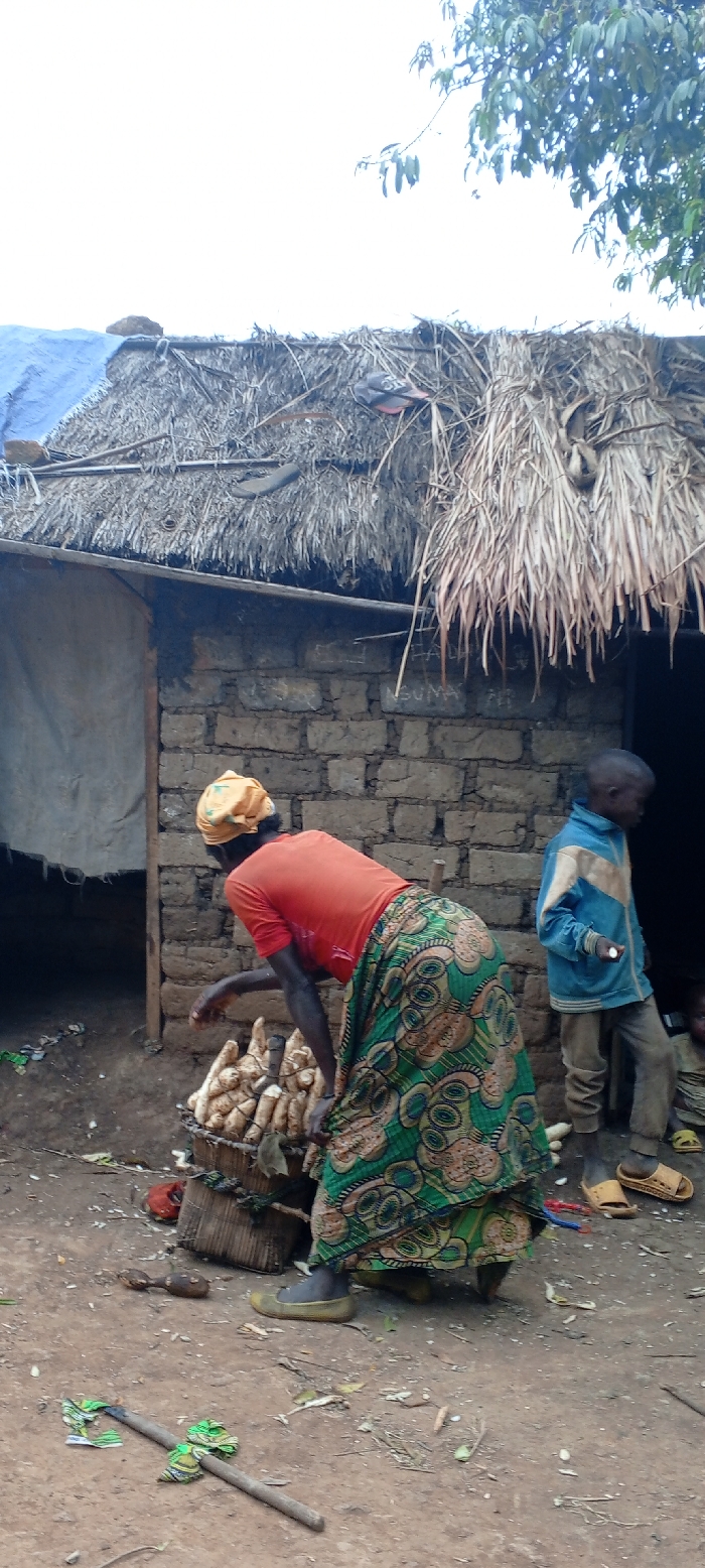 The scene is captured outdoors in Abengwa, Democratic Republic of the Congo, featuring a single-story structure with a dirt ground foreground. An adult female is positioned centrally, bent forward at the waist, facing right, with her back partially towards the viewer. She wears a bright orange short-sleeved top, a long skirt patterned with green, brown, and beige concentric circles, light-colored flat shoes, and a yellow headwrap. Her right arm is extended downwards towards a large, cylindrical, woven basket filled with numerous pale-colored, elongated tubers, some of which are tied together in bundles. To her right, a young male child stands facing left, wearing a blue and white long-sleeved zippered jacket, light brown trousers, and yellow slide sandals. He holds a small, white, ovular object in his right hand. The background features a rudimentary single-story building constructed from large, rough mud bricks, exhibiting faint white graffiti or markings on its surface, including the legible word "NGUMA." The building has a thatched roof, a section of which on the left is covered by a blue tarp. A pair of flip-flops (one red, one black) rests on the thatched roof towards the right. A dark, rectangular doorway is visible on the left side of the structure, where another individual is partially visible inside. The ground is bare dirt with scattered organic debris, small leaves, and minor pieces of refuse. In the immediate foreground, a wooden stick wrapped with green patterned fabric lies horizontally, and a small, brown, gourd-like object is visible near the woman's feet. A red container or bowl is partially obscured next to the woven basket. The upper background shows a bright, overcast sky on the left and green foliage from a tree on the right.