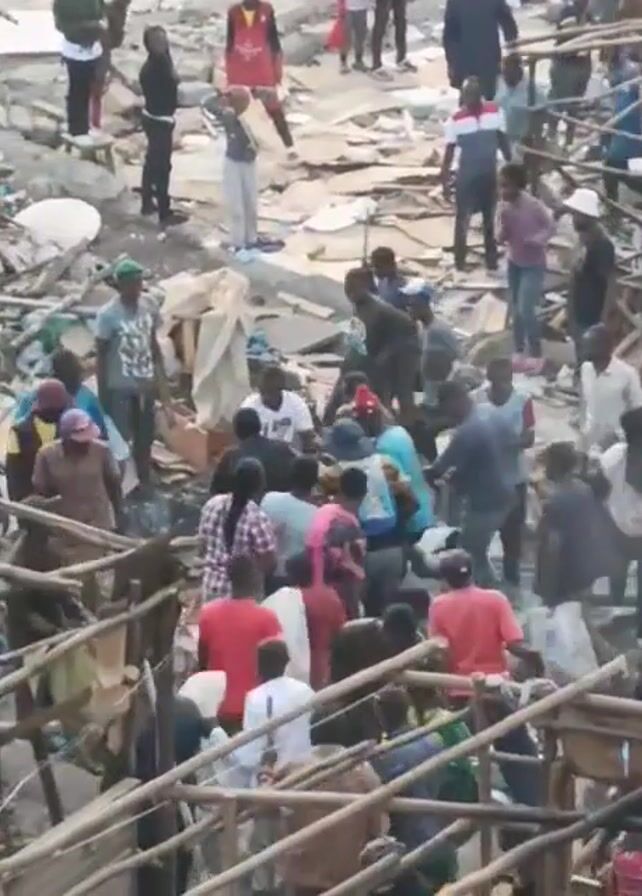 large group of people walking around on a construction site or debris field. There is a large amount of loose debris and materials scattered around. The people are dressed in casual clothing, and some are wearing hats or caps. The camera angle is from an elevated position. Some wooden structures or scaffolding are visible in the foreground.