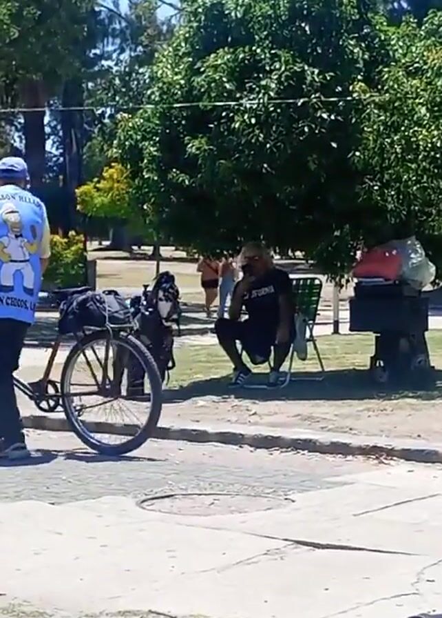 sunny outdoor scene in what appears to be a park. A man in a black shirt and shorts sits on a folding chair under a tree, looking at his phone. Next to him stands a miniature, possibly toy, donkey harnessed as if ready to carry packs. Another man, wearing a black shirt and red-striped shorts, walks into the frame, carrying a white sack over his shoulder. In the background, an ice cream vendor with a bike cart is seen passing by earlier in the scene. Other people are visible in the background, enjoying the park.