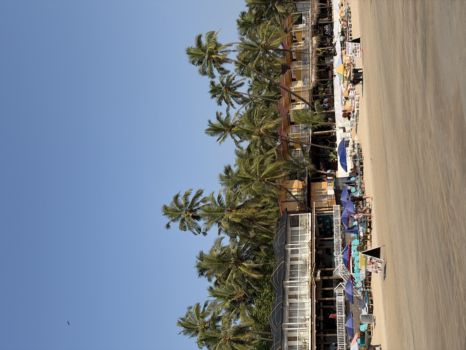 The image displays a sunlit beach scene in Kolamb, India