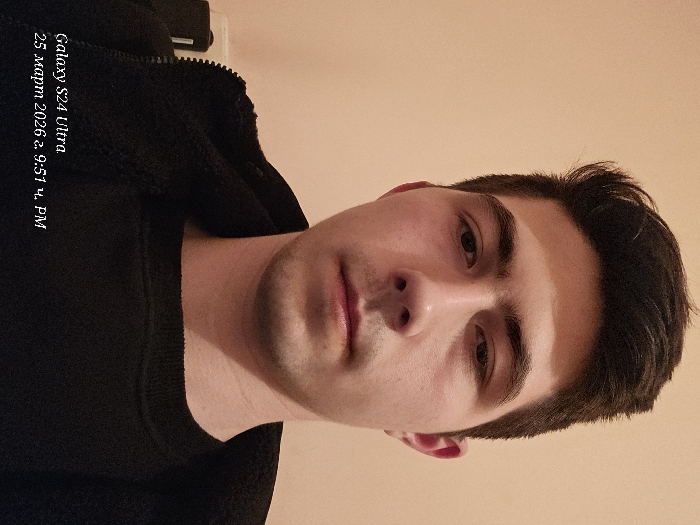 A close-up head-and-shoulders portrait depicts a young adult male in an indoor setting within the city of Svishtov, Bulgaria