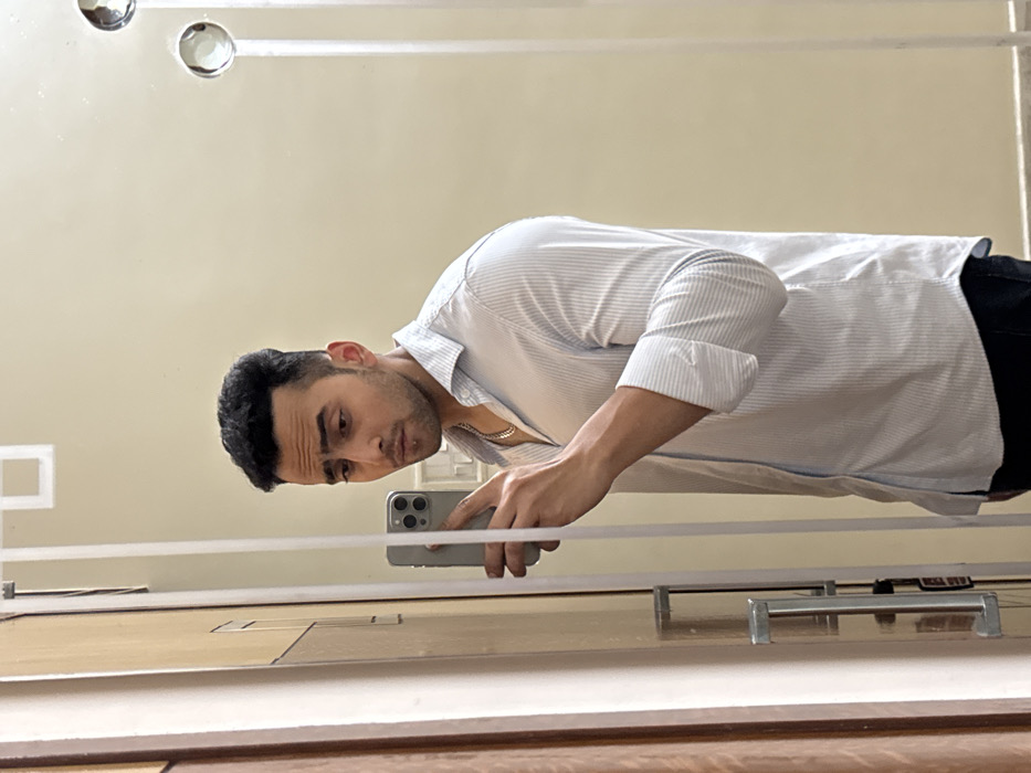 A man in a light blue, striped button-down shirt poses in a mirror. He holds a smartphone with his right hand, capturing a selfie. The reflection includes his dark hair, slight stubble, and a silver chain around his neck. The background is a plain beige wall, and the bottom of the mirror shows elements of a bathroom vanity. Three light fixtures are visible at the top, and silver bars and fixtures are visible on the mirror.