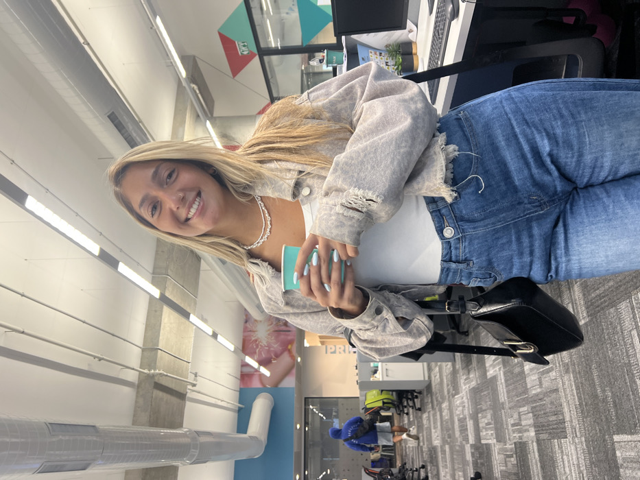 An image taken in an open-plan office environment depicts a smiling young adult female as the primary subject, centered and facing the camera. She has blonde hair, a light complexion, and is wearing a white tank top, a light grey distressed denim jacket with frayed edges and ripped shoulders, and high-waisted blue jeans. She wears multiple white beaded necklaces, a nose ring in her left nostril, and small earrings. Her fingernails are painted light blue. She holds a light blue paper cup in both hands at chest level and carries a black shoulder bag with a gold-colored clasp on her left side. The background reveals a modern office space with grey patterned carpet flooring and an industrial-style ceiling featuring exposed white air ducts and horizontal fluorescent light fixtures. In the left background, a male figure wearing a blue hooded sweatshirt, shorts, and a dark shoulder bag is seen walking away from the camera amidst office chairs and cubicle dividers. In the right background, a white desk holds a black computer monitor, keyboard, and mouse, along with a small potted plant. Walls in the background include a light blue section, a larger wall with a pink-toned graphic, and a wall with a multi-colored geometric design (red, turquoise, white) that partially displays Hebrew text. The scene is brightly illuminated by overhead lighting. The location is an office in Bnei Brak, Israel.