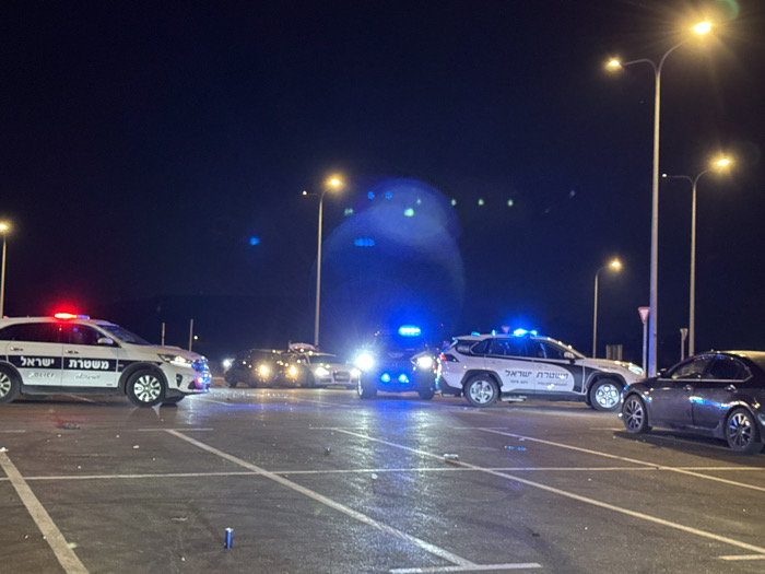 This image depicts a nighttime scene in a paved, open area, likely a large parking lot or plaza, in Petah Tikva, Israel