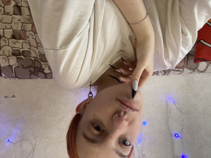 A young female individual is depicted from the chest up, seated indoors. She has reddish-orange hair and fair skin, with her light-colored eyes directed towards the camera. She wears a plain, light-colored (possibly white) crew-neck t-shirt. Her left ear features a silver-colored hoop earring with a small cross pendant, and a thin, silver-toned bracelet is present on her left wrist. Her left hand is raised, with the index finger resting against her lower lip. Her fingernails are long and pointed, exhibiting a two-tone black and white design. The background consists of a textured, light-colored wall illuminated by a string of blue LED fairy lights. To the lower right, a patterned sofa or cushion in shades of brown and grey is partially visible, and a corner of a red object, possibly a pillow, is seen on the far left. The specific location within the city of Engels, Russia, cannot be determined from the visual information provided.