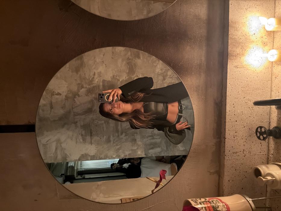 A mirrored selfie captures a woman in a black blazer, a leather top, and jeans. She holds a phone, her gaze directed towards the reflection. The mirror reflects part of a bathroom, showing a sink area. Another person is also seen reflected in the background, blurred. The bathroom’s interior includes textured walls, decorative round mirrors, and antique-style light fixtures.