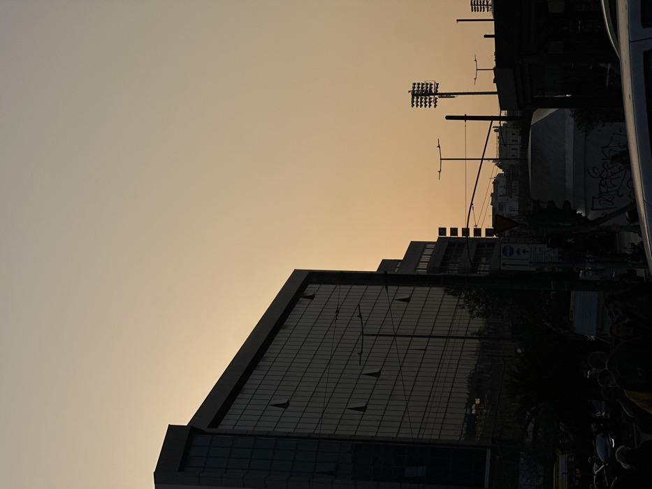 The image depicts an urban street scene at dusk in Athens, Greece, specifically along Syngrou Avenue. The sky, a vast expanse of warm pale orange and yellow, dominates the upper two-thirds of the frame, indicating late afternoon or early evening. In the foreground, the lower portion of the image is filled with silhouetted elements. A gathering of indistinct human figures is visible on the lower left, appearing to stand on a sidewalk or street. To their right, parts of vehicles, including the hood and windshield of a light-colored car, are present. Dark, dense foliage, possibly trees or large shrubs, forms a low line behind the people and vehicles. Street furniture includes dark utility poles, overhead power lines or trolleybus wires crisscrossing the frame, and a traffic light pole with a visible green pedestrian signal. A low concrete barrier or structure with graffiti is also discernible on the lower right. The midground features prominent buildings and structures. On the left, a large, modern, multi-story building with a dark, reflective glass facade occupies a significant portion of the frame. This structure, identifiable as the Onassis Stegi (Onassis Cultural Centre), exhibits distinctive architectural elements, including several triangular or angled window projections from its surface. To its right, and receding into the background, are several other multi-story buildings with darker, less reflective facades. On the far right, a tall mast topped with multiple rectangular arrays of floodlights stands silhouetted against the sky, indicating the presence of a sports stadium or large outdoor facility nearby. Another, smaller floodlight structure is visible further to the right. Various other urban structures and rooftops are faintly visible in the deeper background. The entire scene is rendered in tones of dark silhouette against the glowing sky, with minimal discernible color or detail in the foreground elements due to backlighting.