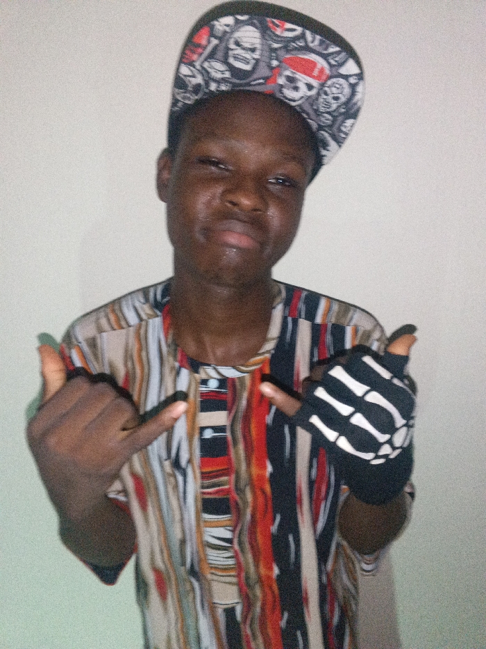 A dark-skinned young man, possibly a teenager, wears a graphic cap adorned with skull images. He's dressed in a multi-colored striped shirt. The man is posing, making a "hang loose" gesture with both hands. He is also wearing a glove on his right hand, decorated with a skeleton bone pattern. The background is a plain light color.