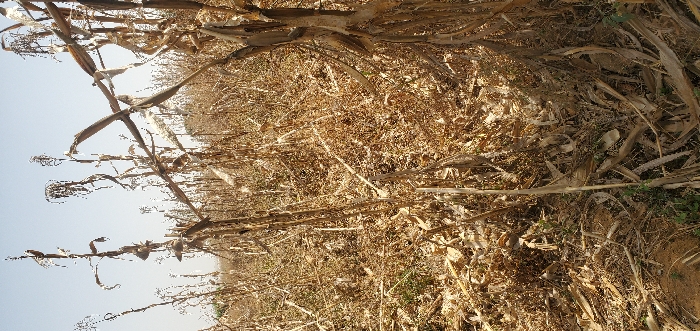 The image displays an agricultural field located in the city of Buga da Gindi, Nigeria. The scene is dominated by numerous dried, brown corn or maize stalks, standing and fallen, covering the entire foreground and midground. The ground is thickly covered with light brown and tan plant debris, including husks and withered leaves. Sparse green vegetation is visible in small patches among the dry ground cover. The sky above is clear and light blue, indicating daytime conditions. No individuals, animals, or prominent man-made structures are discernible within the frame.