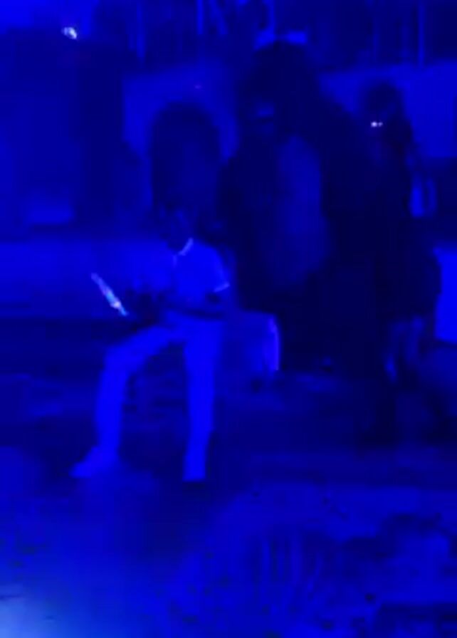 person dressed in white standing in a room lit by a blue light, then a green light. The person is holding an object and appears to be dancing. There are other people in the room, but they are mostly obscured by shadows. The room is decorated with hanging greenery.