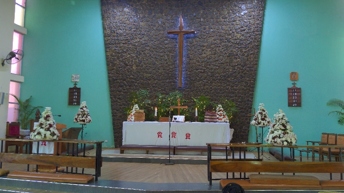 A church interior features a stone wall with a large cross behind the altar. The altar is covered with a white cloth adorned with red symbols. Two floral arrangements flank the altar, complemented by greenery and candles. Wooden pews face the altar, separated by railings. Wall-mounted date boards are visible on either side. The walls are painted a turquoise color.