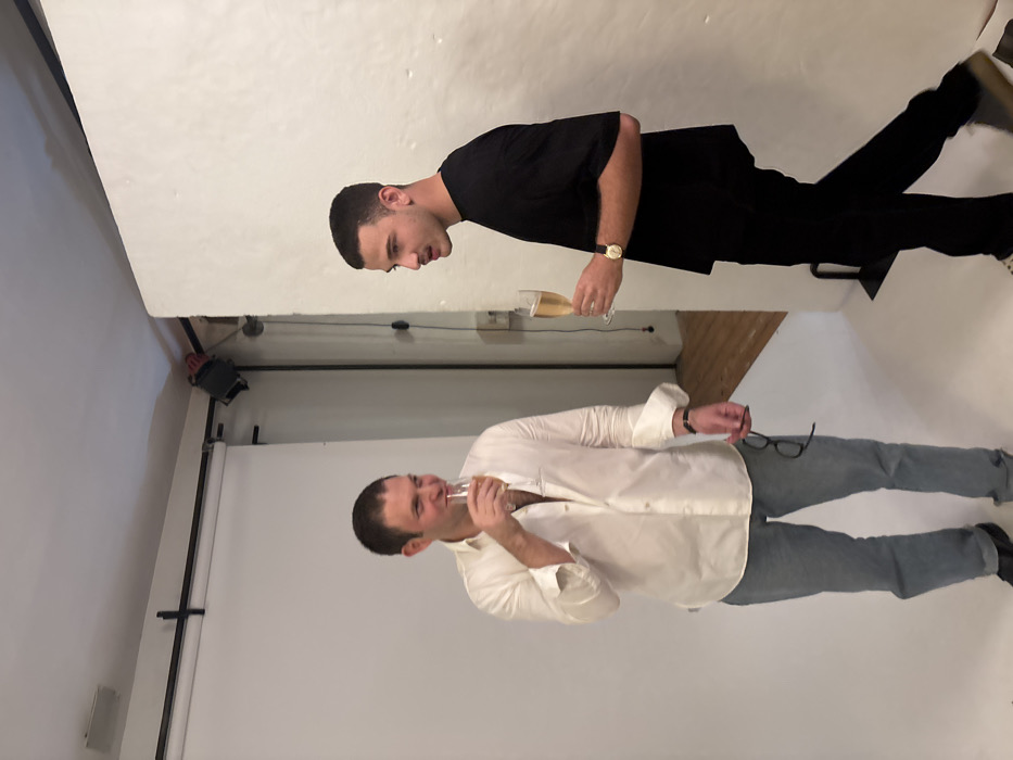 Two men are in a studio setting. One man wears a black shirt and pants and holds a glass of champagne. He is looking down at the second man, who is drinking from a glass. The second man wears a white button-down shirt and blue jeans, and he holds eyeglasses. The background features a white backdrop, and studio equipment is visible in the periphery.