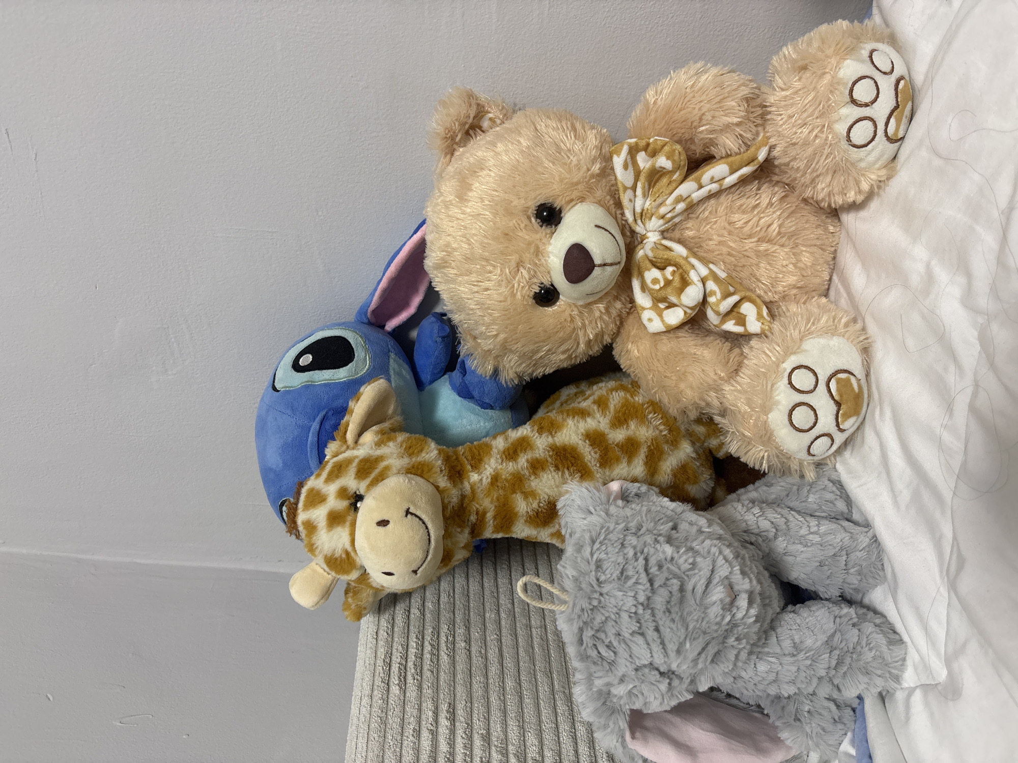 pile of stuffed animals on a gray and white striped surface. The stuffed animals include a blue character with rabbit ears, a teddy bear with a brown and white bow, a giraffe, and a gray stuffed animal. The background consists of a white wall and white bedding. The location is not discernible from the image. There are no people visible.