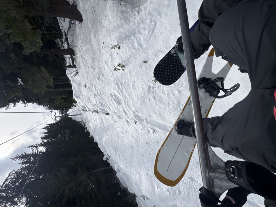 The image presents a first-person view from a ski chairlift ascending a snow-covered mountain slope in the vicinity of Samokov, Bulgaria, likely within the Borovets ski resort. In the foreground, the lower body of an individual is visible, clad in black ski pants and black boots. Their left foot is secured to a white snowboard with yellow tips and a black binding, while a black snowboard with a white polka-dot stomp pad rests under their right foot. The individual's gloved left hand is positioned on the metallic safety bar of the chairlift. Below and extending upwards along the ascent is a steep, snow-covered path. This path exhibits ski and snowboard tracks, and several small evergreen saplings are visible on its surface. Dense coniferous forests line both sides of the chairlift's trajectory. Further along the ascent, additional chairlift chairs and their supporting pylons are discernible, receding into the distance. The sky above is largely overcast, displaying areas of brighter light.