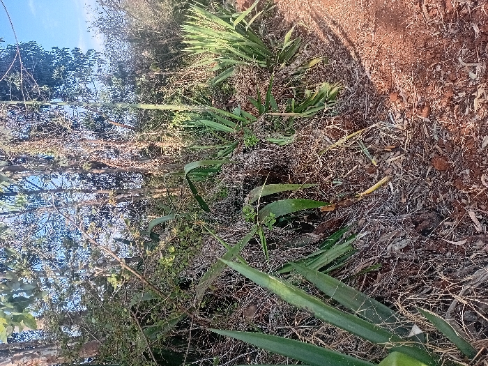 A dense undergrowth scene includes varied foliage, long bladed plants in the foreground and scattered shrubs and trees in the background, some silhouetted against a bright sky. A mix of dry, brown groundcover and reddish soil suggests a natural, uncultivated environment. The composition captures a wild, untamed aesthetic.
