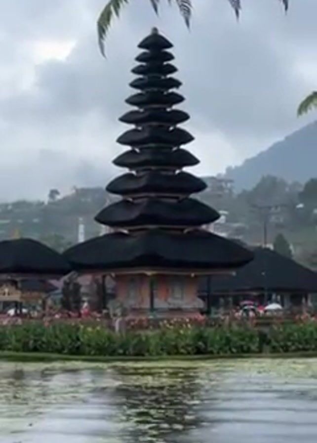scenic view of the Ulun Danu Beratan Temple in Bali, Indonesia. The temple is located on Lake Beratan, and its reflection is visible on the calm water. The sky is overcast, and there is a light rain falling. A fern is in the foreground, partially obscuring the view of the temple. The temple itself is a multi-tiered structure with black roofs and decorative carvings. The temple is surrounded by a variety of colorful flowers. There are some buildings and a mountain visible in the background. People with umbrellas are walking around the complex.