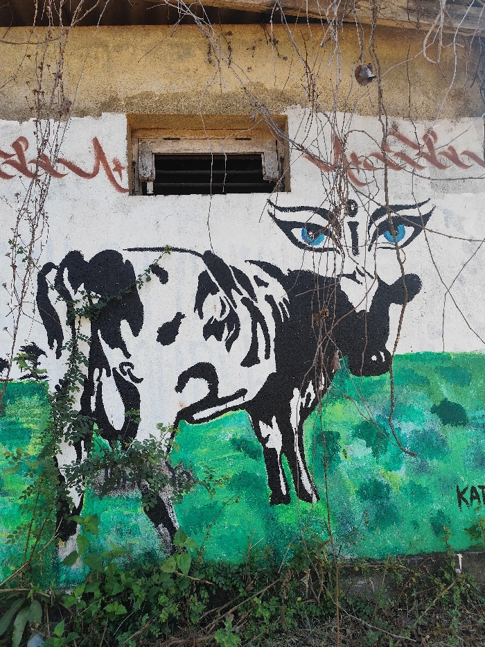 A mural painted on a white wall with green at the bottom depicts a black and white cow. The cow's head is partially obscured by bright blue eyes painted above it, with a small mark in the center of the forehead. Above the mural, there is a small boarded-up window and some red graffiti. Weeds and dry vines obscure the mural. "KAT" is written in the bottom right corner.