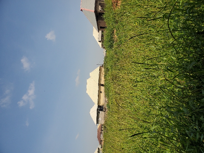 The scene depicts a daytime exterior in the city of Unknown, Unknown. The foreground and midground are covered by a dense field of uncultivated green vegetation, characterized by tall grasses featuring numerous dark, elongated seed heads. In the background, a cluster of single-story structures is visible, primarily residential in appearance. These buildings exhibit various sloped roofs, with colors including cream, white, and reddish-gray, and possess light-toned walls. The sky above is clear blue with sparse, scattered white cumulus clouds. No individuals, specific actions, or direct interactions are identifiable within the frame.