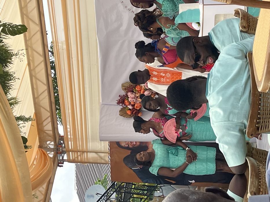 This image depicts an outdoor celebratory gathering in Kumasi, Ghana, held under a large, light-colored canopy draped with white and peach-toned fabric