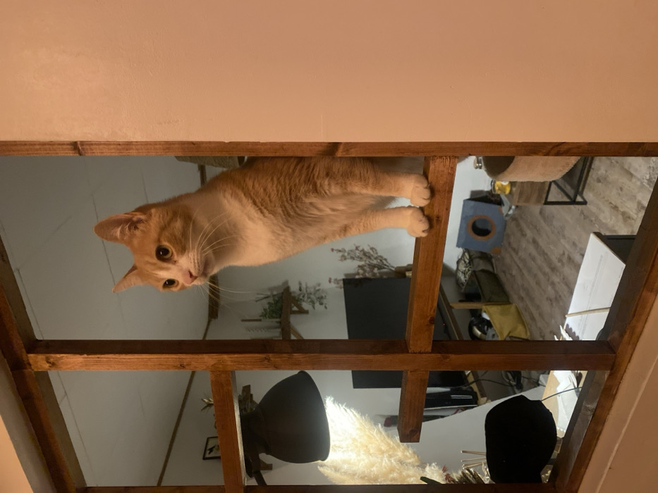 An orange and white cat is seen from a low angle, peering down through a wooden structure with rectangular openings